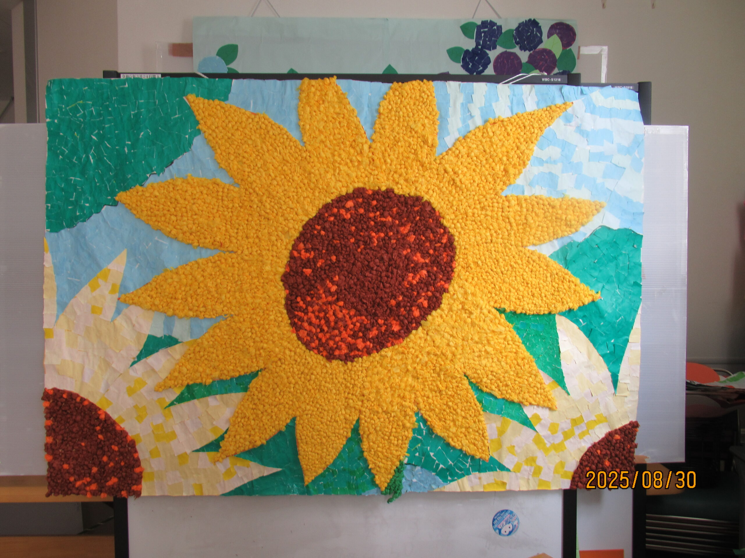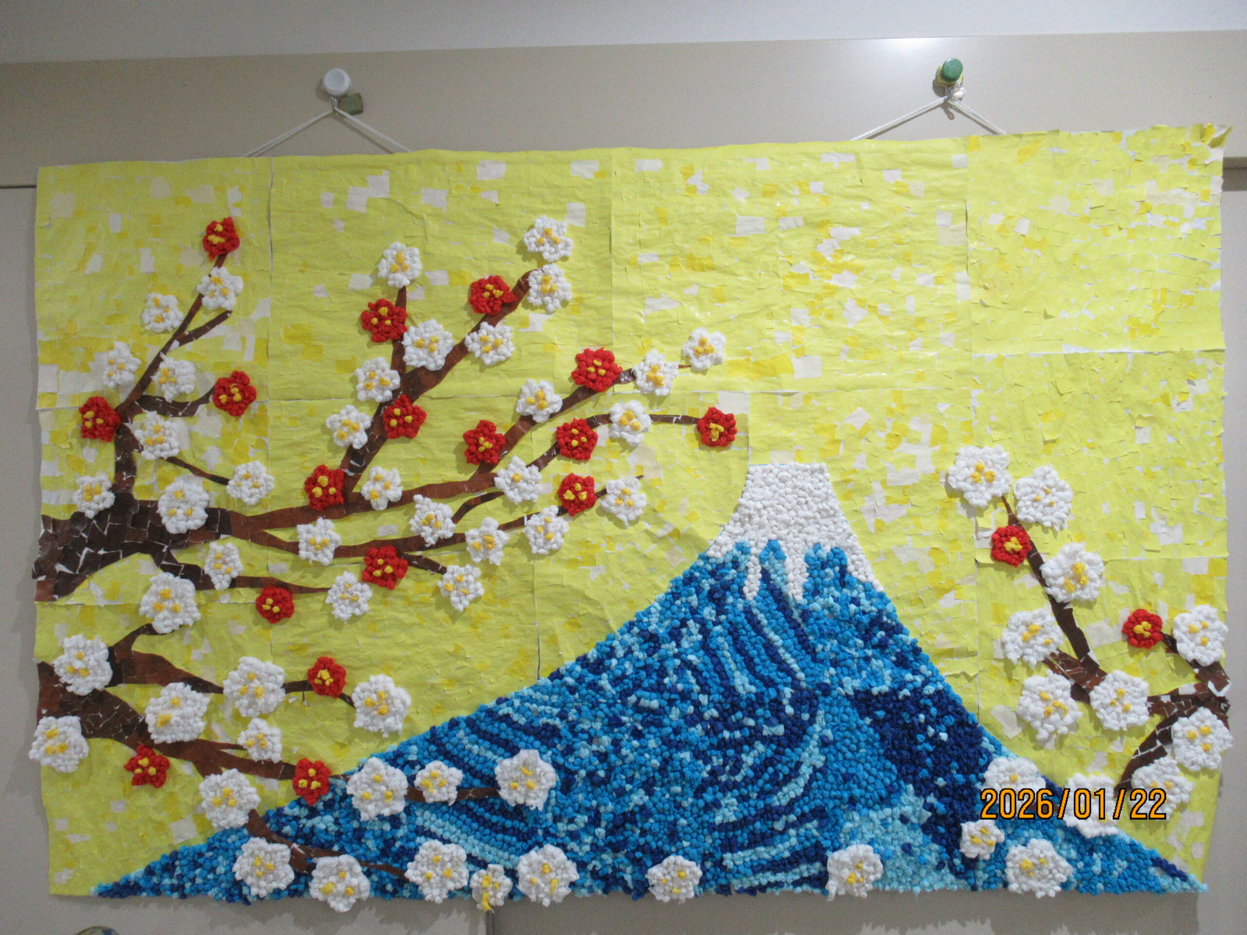 月に1枚季節の壁紙作りと、季節の掲示物の作製を行っています。全ての工程を1人で行う、グループで協力して行う、作業を分担して行うなど患者様のレベルに応じて作業の段階づけを行っています。最終的に一つの物が出来上がる工程を全体で共有できるような創作物の提供を行います。
